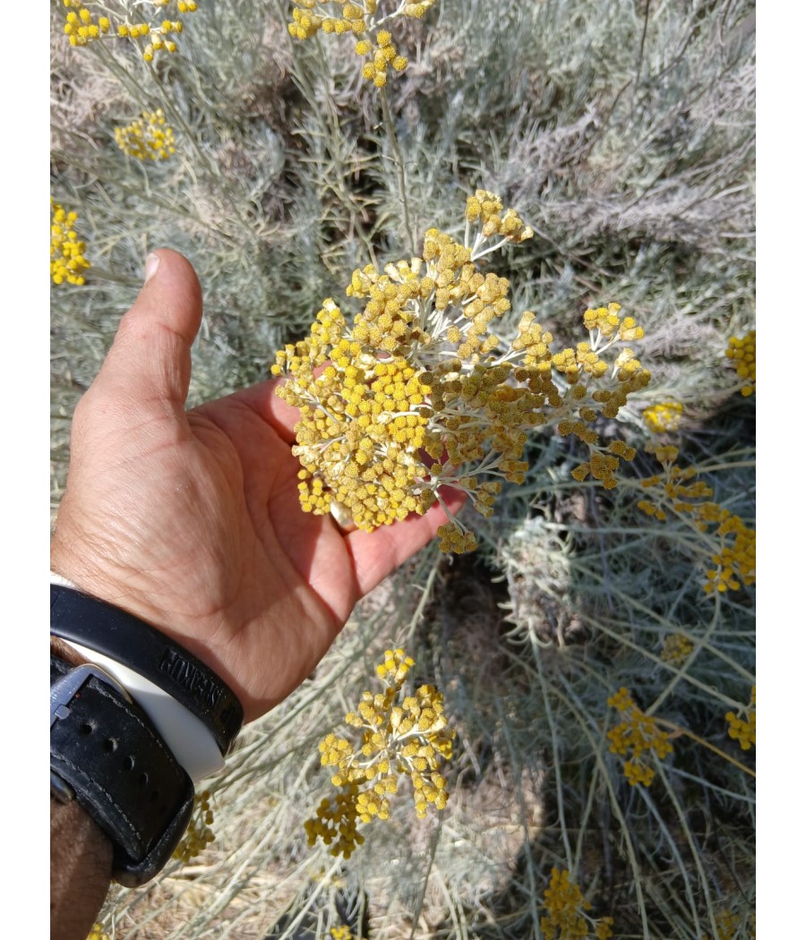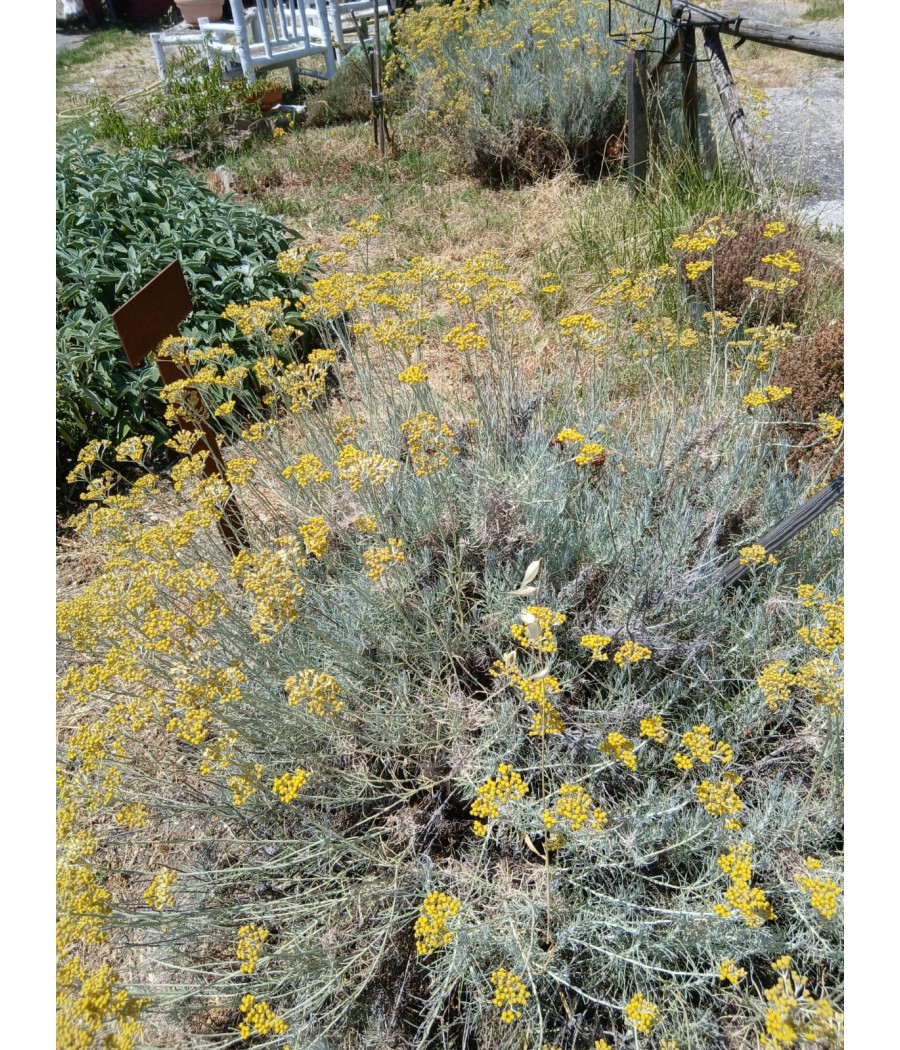 I suoi fiorellini raggruppati in piccolissimi capolini di color giallo derivato dal suo nome greco Helios chrysos tradotto in "Sole d'Oro"